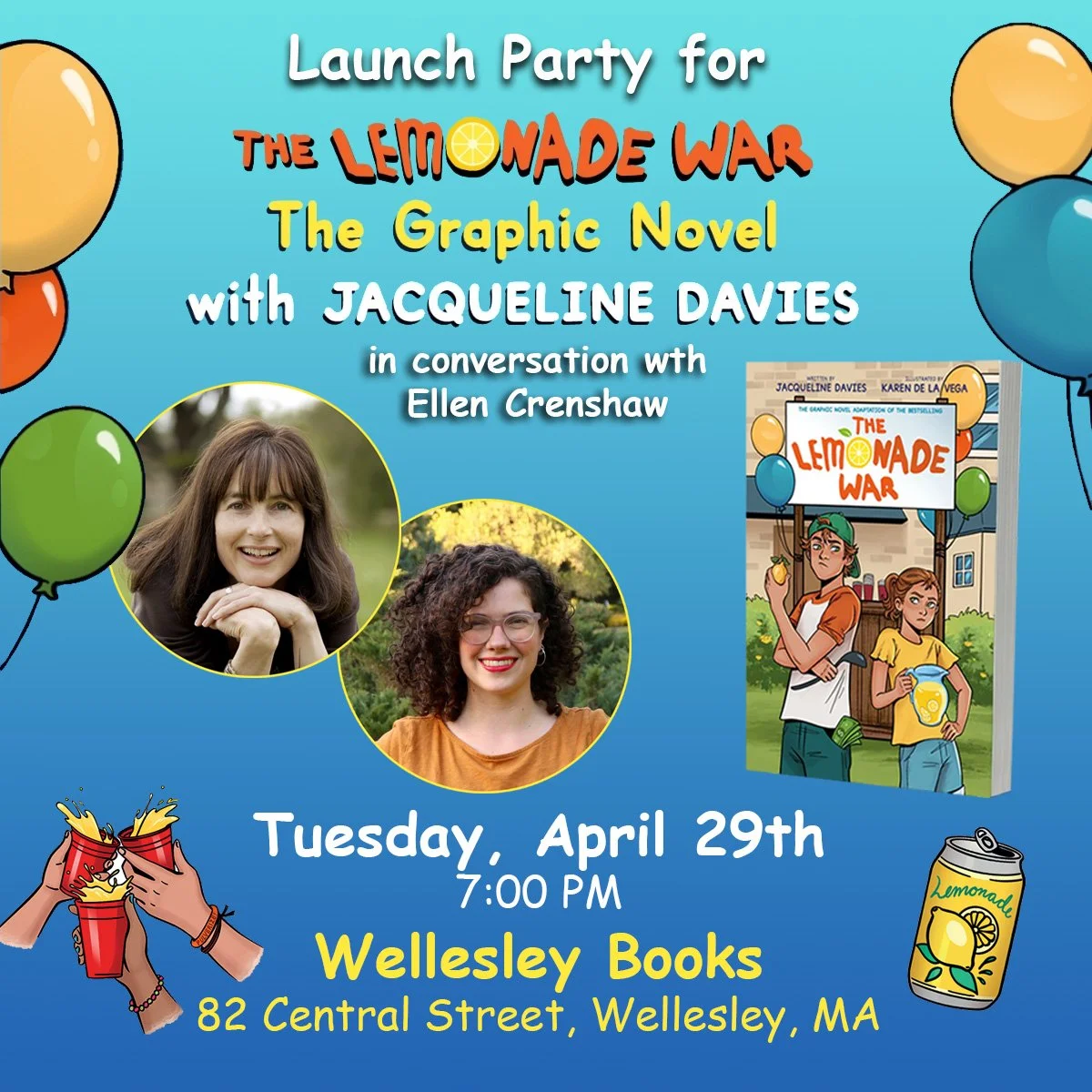 I would love to see you at my party, so if you’re in the area, please come! Ellen and I will be talking about the challenges (and joys) of transforming a beloved children’s classic into a graphic novel for middle-grade readers. We’ll do a DRAMATIC READING from The Lemonade War. There’ll be a fun trivia quiz with prizes, and then some Q&A with the audience. And of course, there’ll be plenty of lemonade and some yummy treats to nibble on. This is a free event but please RSVP.
